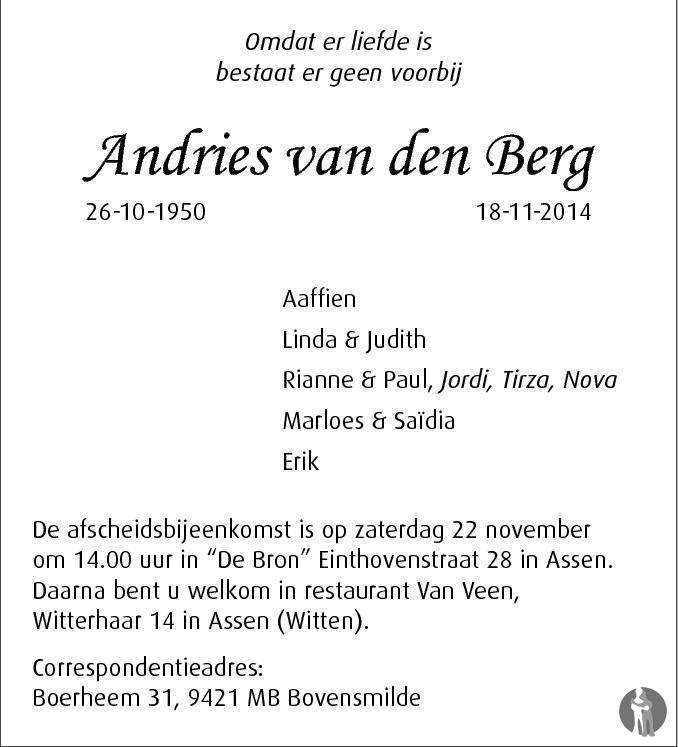 Andries van den Berg 18112014 overlijdensbericht en condoleances Mensenlinq.nl