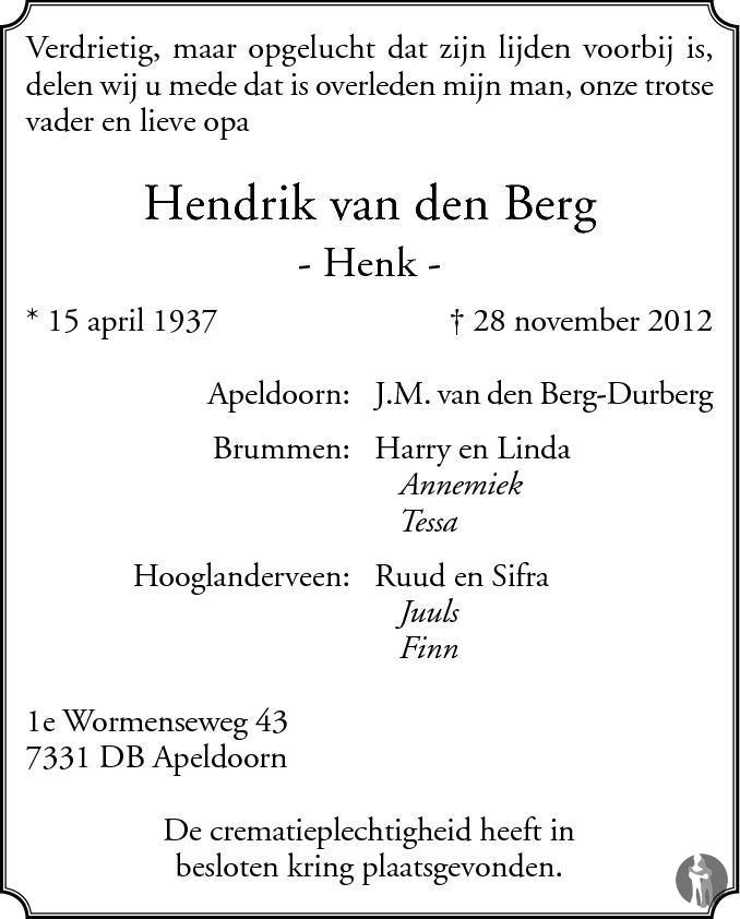 Hendrik (Henk) van den Berg 28112012 overlijdensbericht en condoleances Mensenlinq.nl