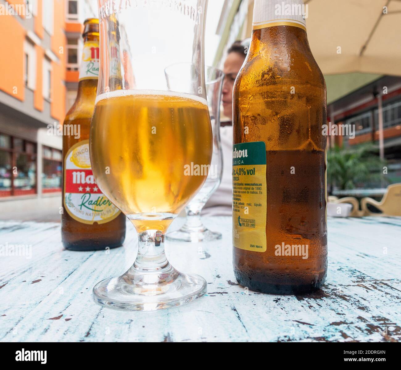 Mature woman drinking Spanish Mahou beer at outdoor cafe/bar in Spain Stock Photo Alamy