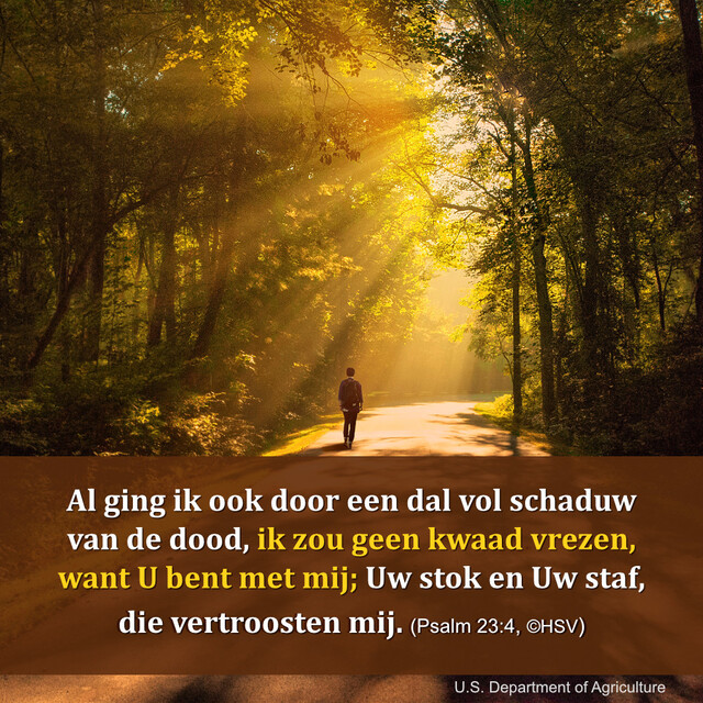 1 Een psalm van David. De Here is mijn herder, mij ontbreekt niets; 2 Hij doet mij nederliggen in grazige weiden; Hij voert mij aan rustige wateren; 3 Hij verkwikt mijn ziel. Hij leidt mij in de rechte sporen. om zijns naams wil. 4 Zelfs al ga ik door een dal van diepe duisternis, ik vrees geen kwaad, want Gij zijt bij mij;