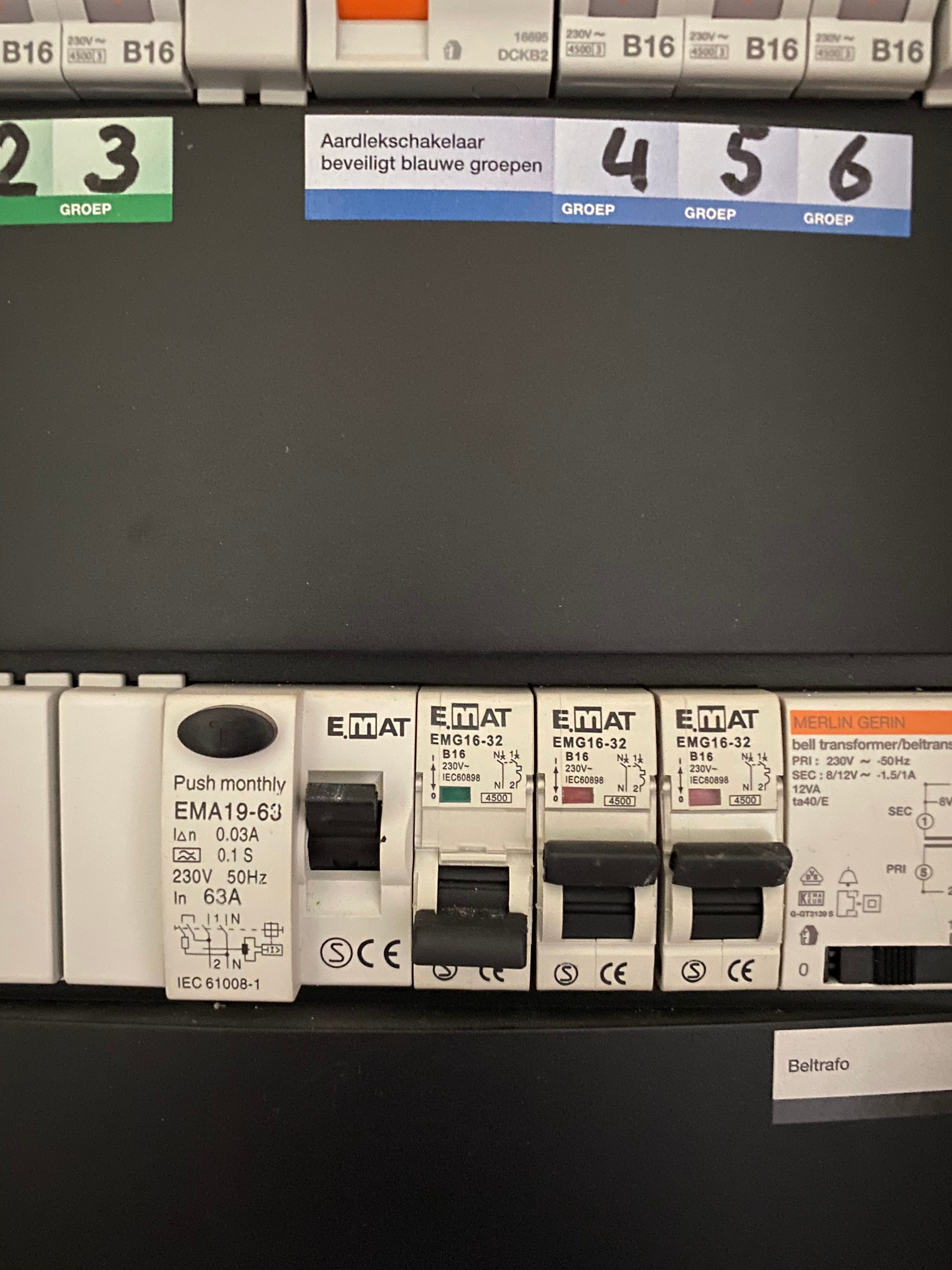 Boven zijn vier stoppen waarvan een met een rood puntje. Daar beneden drie stoppen en daaronder de letters AEG met een schakelaar die kun je omlaag halen en haal je alle stroom eraf om vervolgens weer omhoog te doen. Maak maar een foto van je meterkast. Scheelt een hoop verwarring. donderdag 9 juni 2016 @ 16:00 :48 #8.