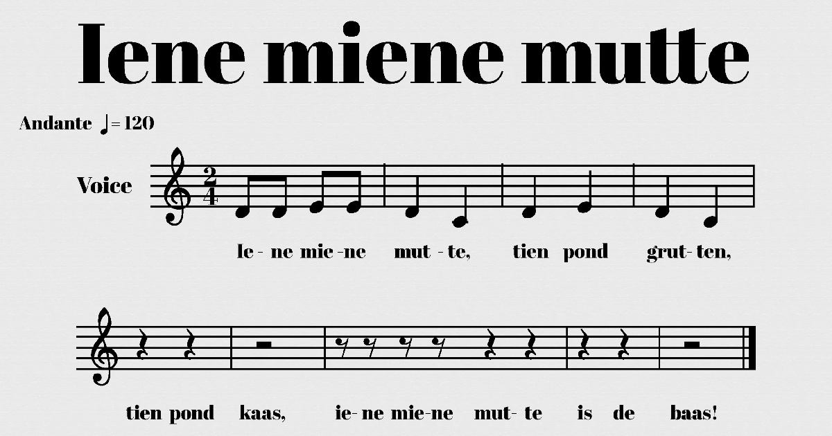 Iene miene mutte tien pond grutte tien pond kaas iene miene mutte is de baas maar jij kan de baas niet zijn want je bent nog veel te klein.