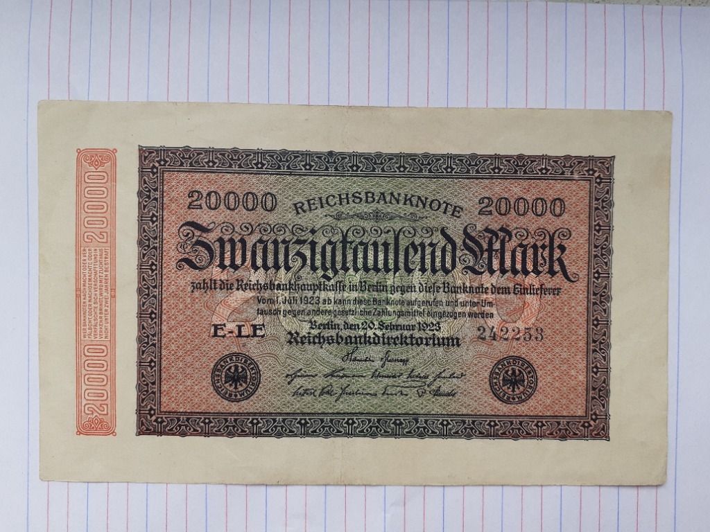 Facial value 20000 mark. Emission bank Post-war Reichsbanknotes and inflation (1918-1924). Discover daily Reichsbanknotes 20,000 mark type 1923 available for sale and updated estimates. Reichsbank. 1918-1924 Post-war Reichsbanknotes and inflation. 20,000 mark type 1923. Date: February 20, 1923. Dimensions: 160 x 95 mm. Watermark: Varieties.