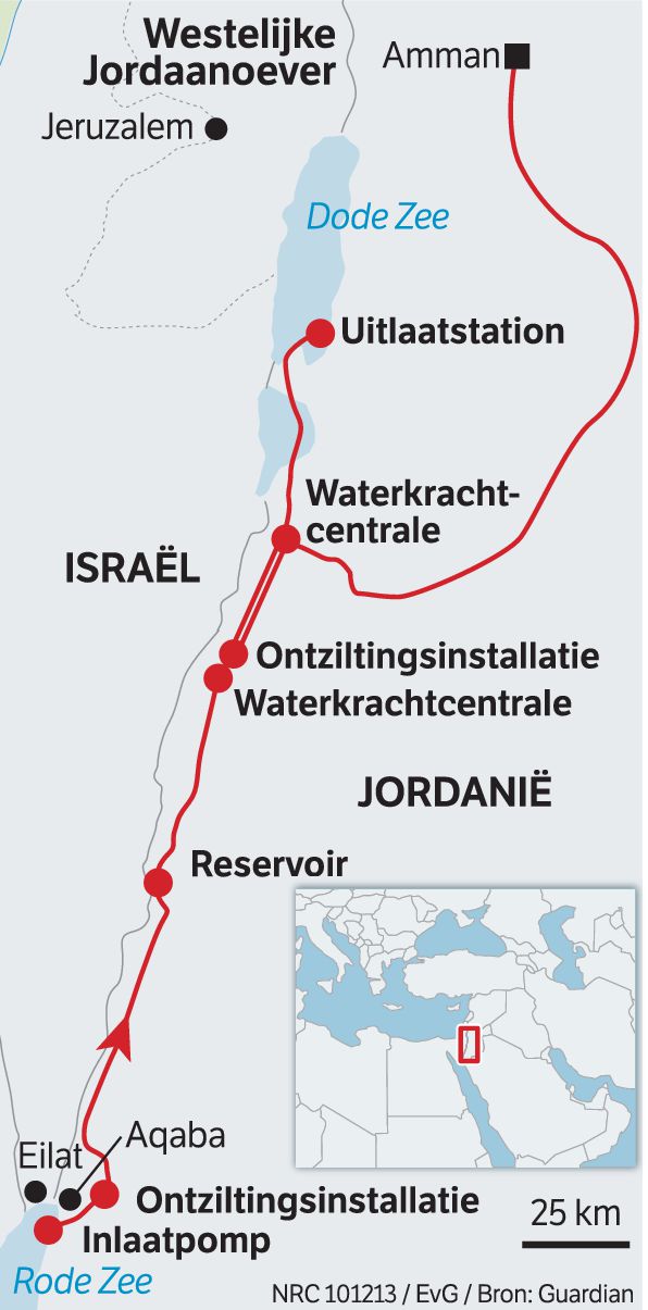 De Rode Zee, die het water moet leveren, ligt ongeveer 180 kilometer verderop. De Dode Zee, het laagste punt op aarde, grenst aan Israël, Jordanië en de Palestijnse Westelijke Jordaanoever.