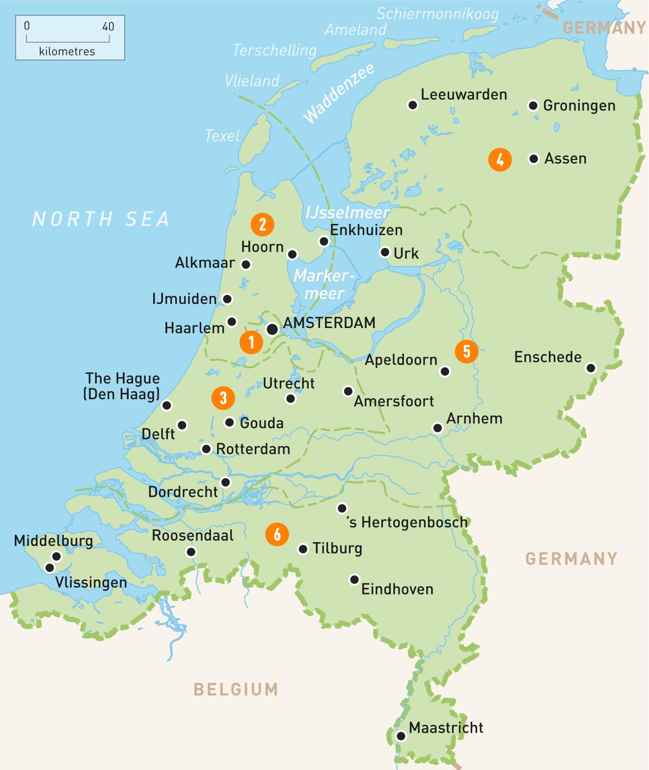This is the region with important cities as Amsterdam, Rotterdam, The Hague (Den Haag), Delft, Leiden and Haarlem. Geography and Climate The Netherlands is located in North Western Europe, at the West and North-West coastline the North Sea; the country borders with Belgium from the South and Germany from the East and Northeast.
